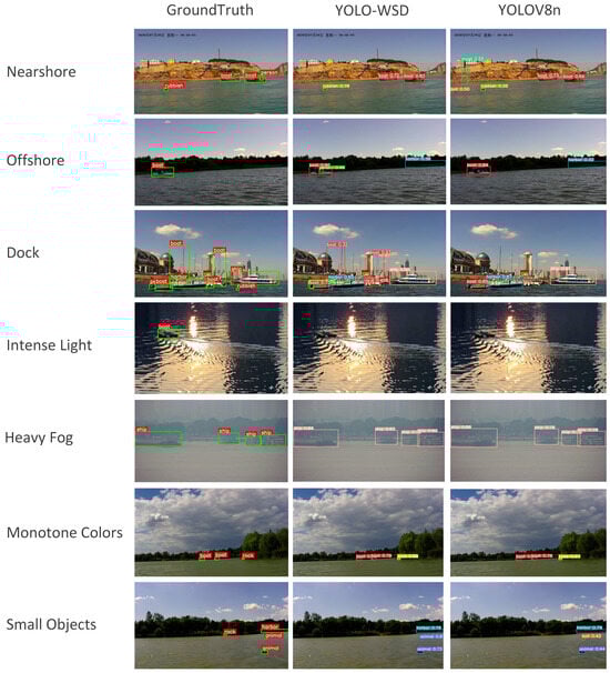In dense target detection scenarios such as docks where boundaries are difficult to distinguish, YOLO-WSD maintains consistency with the GroundTruth, while YOLOv8n exhibits a significant number of omissions. When facing different weather conditions, both models perform similarly, unable to detect targets in strong sunlight but exhibiting good performance in heavy foggy weather. For monochromatic and small target objects, both algorithms successfully achieve recall, but YOLO-WSD exhibits much higher classification accuracy. In summary, YOLO-WSD outperforms YOLOv8n in most scenarios, showing superior detection performance.