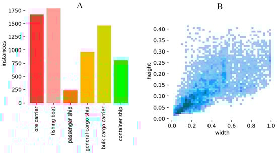 Seaship dataset: (A) instance distribution; (B) instance size distribution.