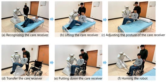 Nowadays, nursing care for disabled people has become very urgent in a rapidly aging society. Transferring a disabled person from or to a bed, a wheelchair, and a toilet is a daily task that brings a heavy burden to caregivers [1]. To alleviate the family burden, the development of the transfer nursing robot has attracted wide attention in recent years [2,3,4,5]. In general, a transfer nursing robot’s operation has six steps, namely, posture recognition, lifting-up process, motion adjustment, moving process, putting-down operation and homing, as shown in Figure 1. It should be noted that motion adjustment is crucial as human comfort can be improved by reducing the human burden (internal and external force) through it [6,7].