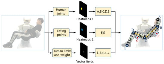 The input of the first-level subnetwork is the lifting state including the posture and weight of a care receiver and the positions of lifting points. Because the multi-modalities are difficult to combine mathematically, inspired by the results presented in [25], this study used an encoder to transform the lift-state into a set of two-dimensional (2D) heatmaps and a set of 2D vector fields [26]. In this way, a unified data form for the first layer network input is generated. The diagram of the encoder is presented in Figure 3.