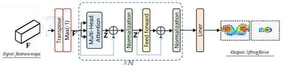 Next, a multi-head attention module is used to analyze the spatial relationship between the obtained features F′. As shown in Figure 6, F′ is split into eight heads that are multiplied with the weight matrices WQi, WKi, and WVi, i = 1, 2, …, 8, to obtain matrices Qi, Ki, and Vi that indicate the query, key, and value of them, respectively [32].