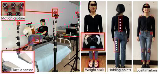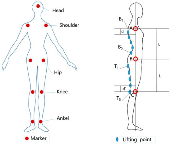 The experiment recruited 50 subjects (20 females and 30 males). The age of subjects ranges from 22 to 65 Y/O, and the average age is 34 Y/O. The heights and weights of the subjects were also different from each other. The heights are from 1.50 m to 1.85 m, and the weights are from 47 kg to 72 kg. As shown in Figure 9, a weight scale was used to weigh the subjects. A total of 10 blocks, evenly distributed on the back and legs of each subject, were selected as candidate lifting points and denoted by (B1, B2, …, B5) and (T1, T2, …, T5), and nine markers were covered on human joint to mark the position of human joint, see Figure 10. A multiple-calibrated motion capture device with a frame rate of 10 Hz was used to record the motion of the joint markers. Two tactile sensors covering the robot’s arms were used to record the contact forces between the human and the robot.