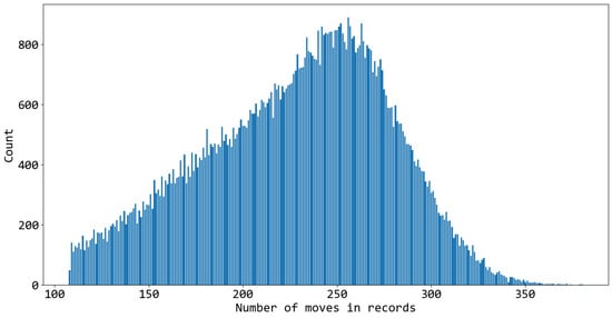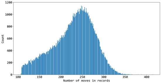 Moreover, an issue is identified. The predicted move is sometimes the same as the last move, which may result from Pass moves. Ultimately, original records are retained without further modification in the preprocessing steps because the number of records with such issues is rare. After cleaning the dataset, Figure 1 and Figure 2 demonstrate the distributions of the total number of moves in the records of the two datasets. From these figures, the observed number of moves in records is completely greater than 100, and most of them are between 200 and 300 where there are fewer records with more than 350 moves.