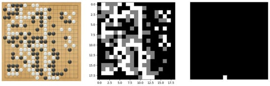Figure 3 demonstrates three board representations for a record. The figure on the far left in Figure 3 is decoded from a record in SGF format. The middle figure is its projection onto a 19 × 19 matrix, where we label empty positions as 0, black stones as 1, and white stones as 2. The figure on the far right depicts the predicted move.
