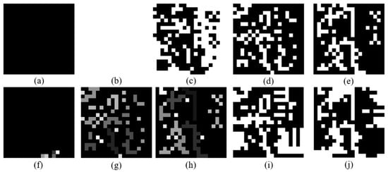 A feature can be composed of several feature planes, and Figure 4 illustrates an example of 10 feature planes. Figure 4a,b represent whether the next move is black or white stone. Figure 4c–e are the current board situation with empty, black, and white positions, respectively. The feature of the last five moves is depicted in Figure 4f. Based on our observations and evaluations, liberty is important in board analysis. Therefore, a feature plane for a black/white stone is included to represent liberty (Figure 4g,h), where each stone on the board is replaced by its liberty value. In this manner, each position in the feature plane is represented by a number between 1 and 6, allowing us to identify dangerous areas. Furthermore, a feature is designed for the territory state, indicating areas certainly controlled by black/white stone in the current board situation, as shown in Figure 4i,j. The concepts of territory and influence in Go are crucial for representing a player’s actual control power and potential impact on the board.