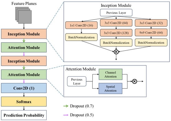 The model architecture constructed in this work largely consists of a customized combination of Inception and Attention modules. This design offers much flexibility in handling various features and tasks, allowing us to adjust parameters as necessary. We develop three models for the task of move prediction. The first is the Incep–Attention model, which combines the Inception and Attention modules (Figure 5). The multiscale design of the Inception module enables the model to learn information at different scales, while the Attention module improves the model’s ability to focus on key features. In the second half of the feature extraction process, the final output is generated by connecting a convolution layer with a single filter to a Softmax layer, instead of using a dense layer. This design maintains the integrity of special features, enabling the model to understand both global situations and specific details on the boar. Our first model contains a total of 867,551 parameters.