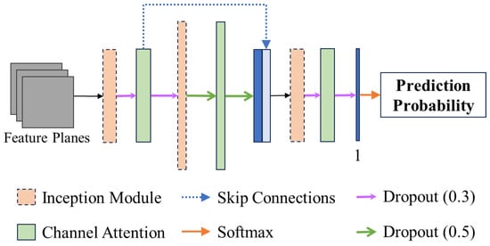 The second is called the Up–Down model, whose design concept involves performing a dimensionality reduction after raising the dimensions, as shown in Figure 6. In this model, the number of parameters is significantly reduced to 106,257, which is one-eighth of our first model. There are three points in our strategy to raise and then reduce the dimensions: Firstly, increasing the size of the feature map facilitates the model to learn more complex and abstract features, thereby improving the overall representation of data. Secondly, performing dimensionality reduction at a deeper layer not only reduces the number of model parameters and the risk of overfitting but also improves computing and forecasting performances. Finally, by applying Channel Attention and Skip Connections, the model retains key features for move prediction while discarding noncritical information.