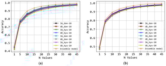 Comparison of TopN accuracies for models on (a) dan and (b) kyu testing data separately.