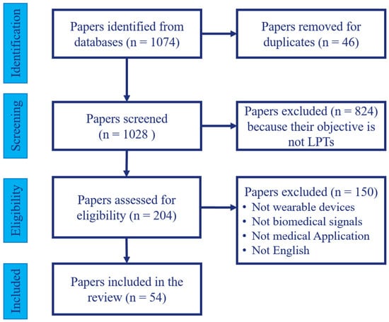 Several procedures were carried out to assess the eligibility criteria of journals, conference papers, proceeding papers, and articles from databases. In the first step, a total of 1074 papers were collected for review. Secondly, we screened the gathered documents and eliminated 46 papers for being duplicates and 824 papers for not meeting the objective criteria. Thirdly, 150 papers were excluded as they were not aimed at wearable medical devices, biomedical signals, physiological monitoring, or medical applications in healthcare. Finally, 54 studies that met the criteria were selected and used for analysis. However, this review did not consider the citation count during the paper selection process, since the number of citations may differ among various databases. Additionally, depending on the criteria, articles that did not focus on LPTs, wearable devices, biomedical signals, or medical applications were excluded from our work. The process of reviewing and selecting papers based on specific criteria is outlined in Figure 1.