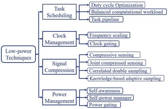 The categorization and classification of LPTs specifically applied in wearable devices can be conducted depending on their characteristics. We classified the LPTs into four main categories: task scheduling, signal compression, clock, and power management, as shown in Figure 2. The first category of this taxonomy includes task scheduling to reduce power consumption in processors or systems. The second category targets clock management, since the clock rate has a relationship with power consumption in circuits. The third category is an application-based category based on the sample rate of the signals. The last category is smart power management, which dynamically adjusts and analyzes the operations for energy efficiency. A novel taxonomy can be applied to hardware, software, applications, and dynamic adjustments in low-power wearable medical devices.