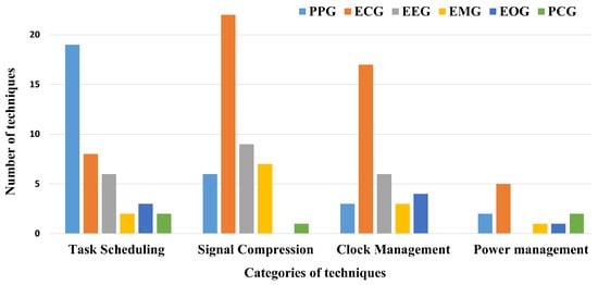 As depicted in Figure 5, the majority of studies in wearable devices employ signal compression as one of the methods to conserve power in their design. The subcategories within these classifications are determined by their shared characteristics for enhancing power efficiency in wearable devices, as explained in Section 5.1. Task scheduling, signal compression, clock, and power management are the most frequently utilized strategies in wearable systems. Signal compression is commonly utilized in wearables, as it has been found to be the most frequently used strategy. This is due to the fact that compression and sampling techniques are effective in reducing power consumption [36].