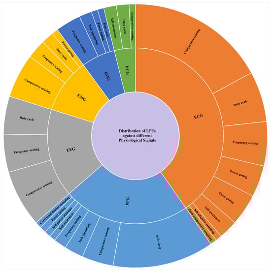 An ECG signal exploits a CS approach to process signals through wearable devices, as elaborated in many works. Accordingly, 42% of the work exploits the CS technique in ECG signals. Similarly, 43% of the work applies the CS approach to EEG signals. Furthermore, 54% of the work utilizes the CS technique in EMG signals, while 20% of the work capitalizes on this technique in PCG signals. The aforementioned strategy is also utilized for various other physiological signals, including the PPG signal, as reported in [19,100]. Nearly 16% of the works apply self-awareness and clock gating, 10% of the works apply power gating, 4% of the works apply JCS and knowledge-based adaptive sampling, 15% of the works apply duty cycle optimization, and 13% of the works apply frequency scaling in ECG signals. Similarly, a summary of the respective LPTs, the percentage of their application, and various biomedical signals are presented, as depicted in Figure 6.