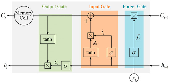 During the training process of the LSTM network, the state ct of the memory cell at time t is composed of a forgotten part and a retained part. The forgotten part is determined by the input xt, the state ct−1 of the memory cell at time (t − 1), and the intermediate output ht. The reserved part of the state is jointly determined by the output of xt after being transformed by the sigmoid function (σ) and the tanh function. Additionally, in the output gate, xt and ct are transformed to obtain ht. The calculation formulas for each variable in Figure 1 are written as follows:
