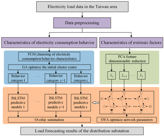 PCA is used to extract the principal components of the high-dimensional external factor data and be input into the BiLSTM network for training. At the same time, the FCM algorithm is used to cluster the user electricity consumption data, the optimal initial clustering center is obtained based on the GA algorithm, and the user datasets of different electricity consumption behavior categories are obtained.
