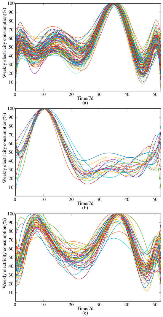 Clustering results of electricity consumption behavior characteristics: (a) Category 1 electricity consumption behavior of 109 users; (b) category 2 electricity consumption behavior of 18 users; (c) category 3 electricity consumption behavior of 47 users.
