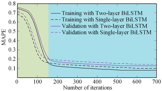 To evaluate the effectiveness of the two-layer BiLSTM network, single-layer and two-layer BiLSTM networks are separately trained using the training set. The models are optimized using SGD. Furthermore, the training process is compared based on the loss of the training set after each iteration, as shown in Figure 6. The loss of the validation set is also plotted in Figure 6, and it can be found that the validation set is closer to the training set, which solves the overfitting problem better. It can be observed that both network structures significantly reduced the loss values after 150 iterations. By 600 iterations, the loss values had stabilized. Additionally, the two-layer BiLSTM network consistently exhibited lower loss values, demonstrating superior forecasting performance.