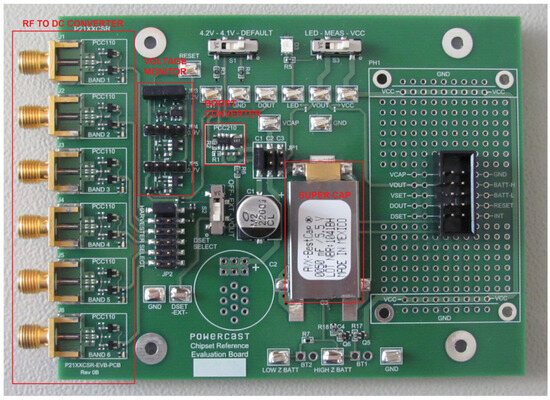 For testing purposes, it is also possible to change the capacitance of the capacitor at the output VCAP and to disconnect the LEDs (D1–D6) in the individual harvester modules (Figure 2). A general view of the development board is presented in Figure 3.