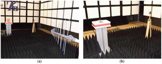 Measurement stand for the analysis of electric field strength distribution (power density) in an anechoic chamber: (a) stand with HL223 antenna as the source of the electromagnetic field; (b) adopted concept for the measurement of field distribution—principle of symmetry of antenna radiation characteristics.
