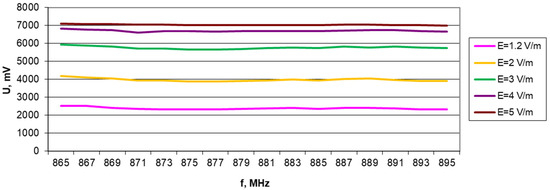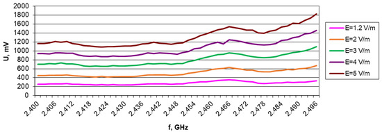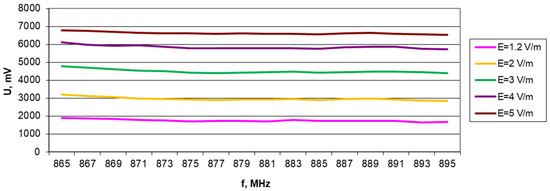 During the measurements, the required field strengths for the tested band were set using the EMS_1GHz and EMS_6GHz kit software. Continuous feedback obtained from the HI6005 probe coupled with control over the output power level feeding the HL223 antenna system and checking the current standing wave ratio VSWR enabled automation of the entire process and enhanced precision of the obtained results [23]. The achieved field strengths were adequate for the system under test, while ensuring consistent and reproducible measurement conditions. The SAC chamber was previously also attenuated with absorbers with suitable characteristics.