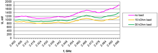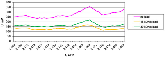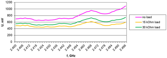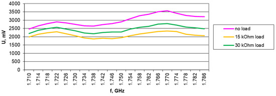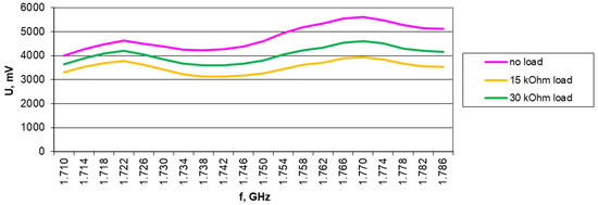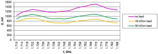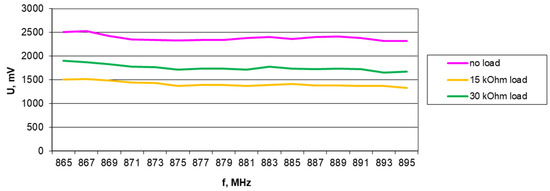 Results of harvester output voltage measurements without load, with 15 kΩ, and with 30 kΩ load for the Europe RFID/GSM850 band (downlink) in 1.2 V/m electromagnetic field for A6 antenna.
