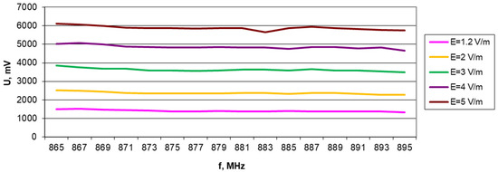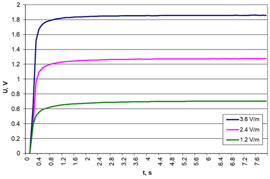 Results of voltage measurements on a 1000 μF capacitor for different electric field strengths and a frequency of 879.5 MHz.