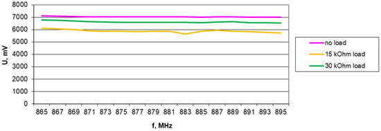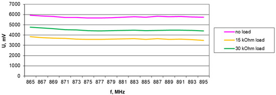 Results of harvester output voltage measurements without load, with 15 kΩ, and with 30 kΩ load for the Europe RFID/GSM850 band (downlink) in a 5 V/m electromagnetic field for the A6 antenna.