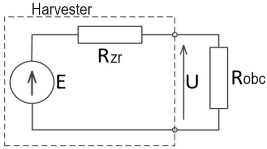 To conduct a more detailed analysis of the operation of the harvester system, numerous factors would have to be considered, and this significantly complicates the issue. In the simplest scenario, the system of the tested harvester can be modeled as a voltage source E with series resistance RZR (Figure 25). The value of the voltage source E in this system depends heavily on the environmental conditions, i.e., the strength and frequency of the electromagnetic field. By recording results of voltage measurements of the tested harvester operating under the same conditions with and without a load, the values of the internal resistance of the source for the applied model of the harvester system can be determined. It is also possible to determine the power dissipated at the attached loads and the impedance matching of the power and load systems. It is important to note that the RZR of the harvester is a highly nonlinear parameter, influenced by the system design, the energy supply, the antenna used, and the load stage.