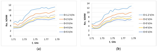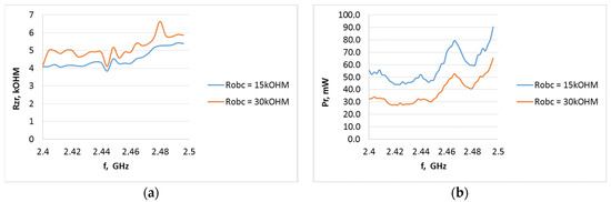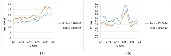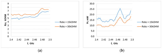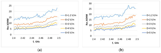 Internal resistance of the P21XXCSR harvester system as a function of frequency from 2.4 to 2.495 GHz (WiFi) at different field strength levels for the A3 type antenna when the system output is loaded with resistance: (a) 15 kΩ, (b) 30 kΩ.