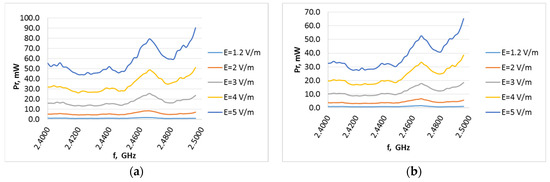 Harvester output power on load (a) 15 kΩ and (b) 30 kΩ as a function of frequency from 2.4 to 2.495 GHz (WiFi) at different electric field strengths for antenna type A3.