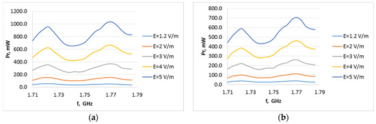 Harvester output power on load (a) 15 kΩ and (b) 30 kΩ as a function of frequency from 1.710 to 1.785 GHz 1800GSM uplink at different electric field strengths for antenna type A5.
