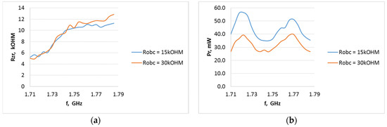 Internal resistance of the P21XXCSR harvester system as a function of frequency from 1.710 to 1.785 GHz 1800GSM uplink at different field strength levels for an A5 type antenna when the system output is loaded with resistance: (a) 15 kΩ, (b) 30 kΩ.