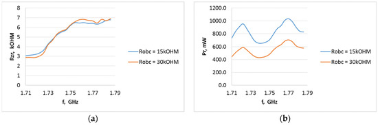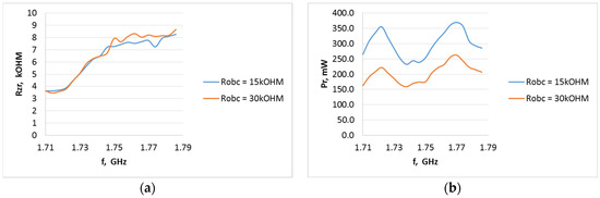 Internal resistance of the P21XXCSR circuit (a) and harvester output power at variable load (b) as a function of frequency from 1.710 to 1.785 GHz 1800GSM uplink when operating in an electric field of 3 V/m using an A5 type antenna.
