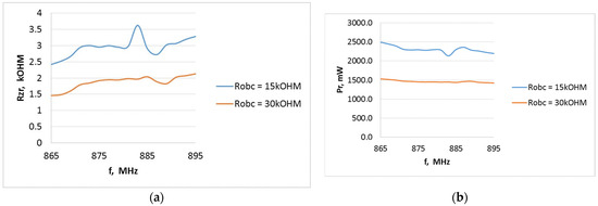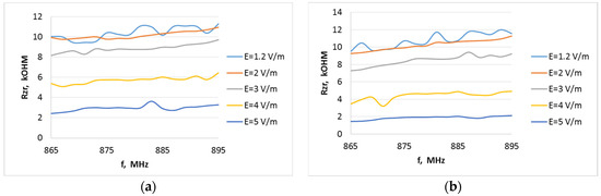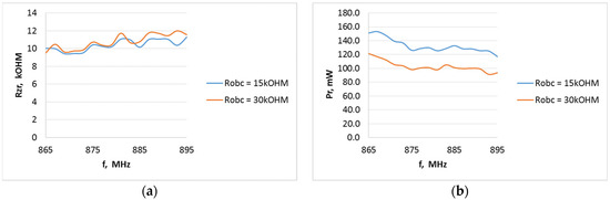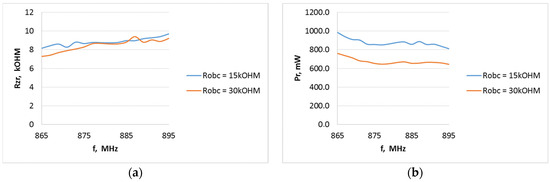 Internal resistance of the P21XXCSR harvester system as a function of frequency from 865 to 895 MHz (Europe RFID/GSM 850 downlink) at different field strength levels for the A6 type antenna when the system output is loaded with resistance: (a) 15 kΩ, (b) 30 kΩ.