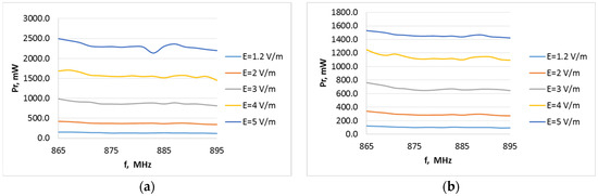 The selected characteristics of the variation in the resistance of the adopted surrogate source and the power dissipated at the load of the tested harvester, considering changes in the system operating frequency and the available electromagnetic field strength in the surrounding environment, have been shown in Figure 26, Figure 27, Figure 28, Figure 29, Figure 30, Figure 31, Figure 32, Figure 33, Figure 34, Figure 35, Figure 36, Figure 37, Figure 38, Figure 39 and Figure 40.