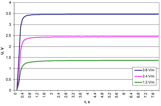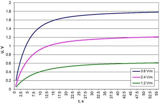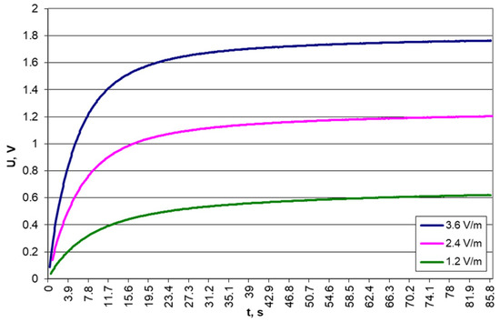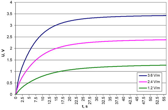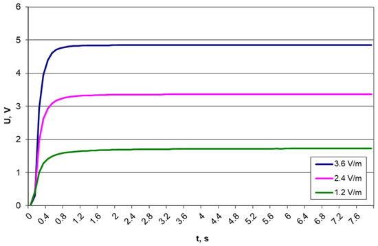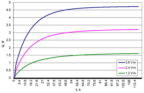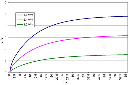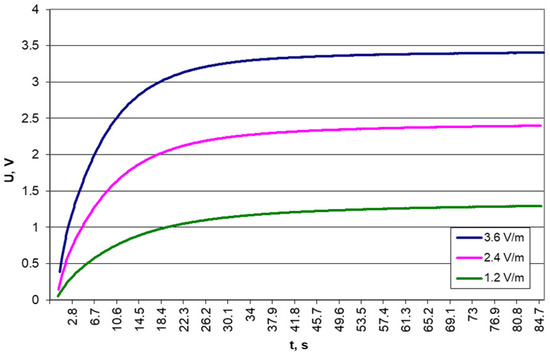 Results of voltage measurements on a 10 μF capacitor for different electric field strengths and a frequency of 879.5 MHz.