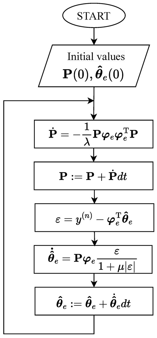 In order to better understand the operation of the proposed method, a flowchart for the control system is presented in Figure 5 and for the implementation of the RLS equations in Figure 6.