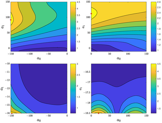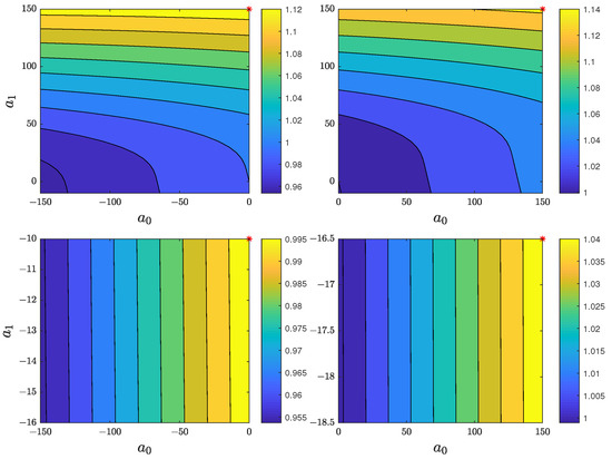 If the parameters of the linear part of the system dynamics are very close to zero , the use of a model-based ADRC will not noticeably affect the gain values, and thus the control quality. With precisely known parameters, only a small improvement in quality can then be seen. It is also worth noting that, for and , the obtained gains ratios and are equal to one. Moreover, in the region , better measurement noise suppression properties of ESO will be obtained in mbADRC (smaller gain values will ensure less noise transfer).