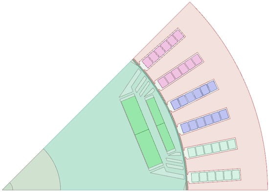 The two-dimensional finite element model of the motor is shown in Figure 3. The motor adopts 8 poles and 48 slots; the stator slots are designed as rectangular slots, the flat-wire winding is adopted to improve the efficiency and power density of the motor, and the rotor is a built-in “one” type double-layer permanent magnet structure, which can effectively increase the speed range of the motor and the percentage of the high-efficiency zone.