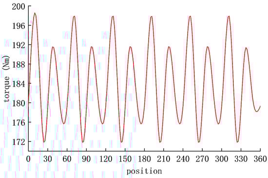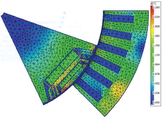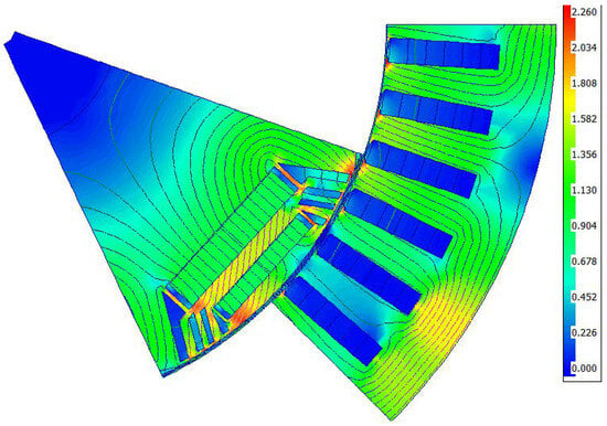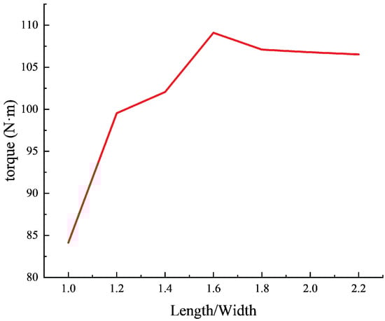 In the optimization of aspect ratio for the suppression of AC losses, the motor torque output performance will also be affected, with the conductor width increasing, the corresponding stator yoke part gradually shortening and the magnetically saturated situation of the yoke becoming more serious, so that the motor output torque capacity shows a trend of first increase and then decrease, as shown in Figure 17. Therefore, taking into account the motor’s AC losses and torque output and performance, the conductor aspect ratio of 1.6 near the electromagnetic torque reaches the maximum, combined with the conductor aspect ratio on the loss of the impact of the winding aspect ratio of 1.6, that is, the flat conductor cross-section length of 4.22 mm and width of 2.64 mm.