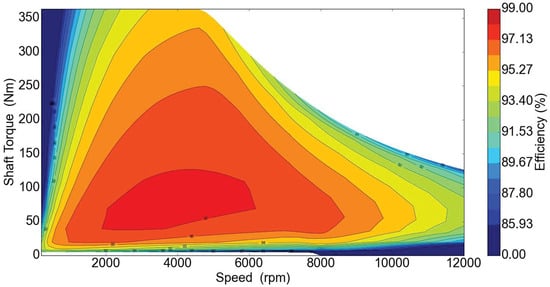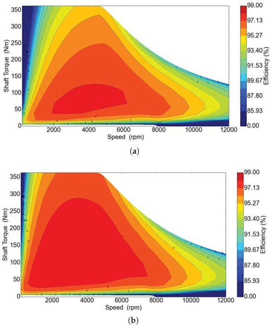Through comprehensive simulation calculations across the entire speed range, the efficiency map diagrams of the motor before and after optimization were obtained, as shown in Figure 22. The comparison reveals that the optimized motor achieves a peak efficiency of 98.1%, while the original motor’s peak efficiency is 97.41%. The high-efficiency region of the optimized motor is shifted towards higher speeds and it occupies a larger proportion. Additionally, due to the reduced AC losses in the optimized motor, it exhibits a higher average efficiency.
