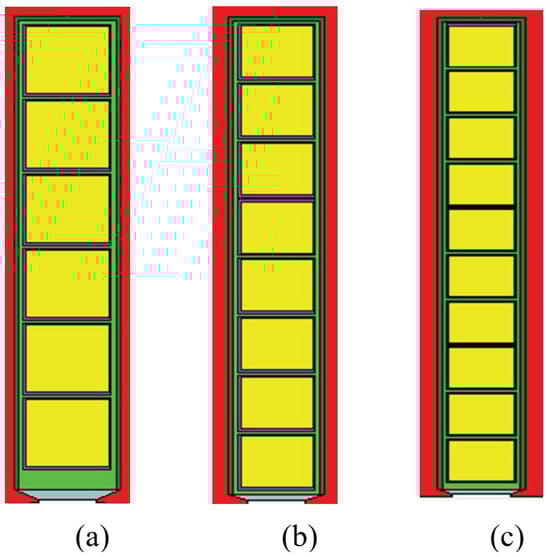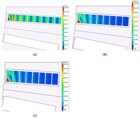 Figure 15 shows the loss distribution of three different models under eight layers of windings. The simulated AC losses are 1226 W, 402.6 W and 343.3 W. It can be seen that the smaller the length–width ratio of the 8-layer conductor is, the higher the copper loss of the conductor closest to the tooth-tip layer is and the larger the ratio to the total copper loss is. The size of the difference in the impact of copper loss mainly lies in the conductor across the slot leakage magnitude of different sizes; as the conductor aspect ratio increases, the width decreases and the magnetic field distribution of the amplitude drop along the bottom of the slot decreases; from the results of the model of a conductor, the leakage magnitude across the slot is the largest, corresponding to the generation of AC copper consumption also being the largest.