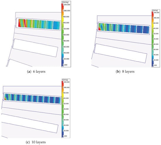 The AC losses of different layers of flat copper wire windings under a rated speed of 6000 r/min are shown in Figure 10. It can be seen that the AC copper loss mainly exists in a conductor near the tooth tip and slot opening. This is because the main component of AC copper loss is the slot flux leakage. The closer to the top position of the slot or at the slot opening, the smaller the influence of leakage flux and the larger the influence of the skin effect and proximity effect. As the number of layers increases, the total cross-sectional area of the conductor remains unchanged and the cross-sectional area of individual conductors becomes smaller, reducing the AC copper loss caused by flux leakage.