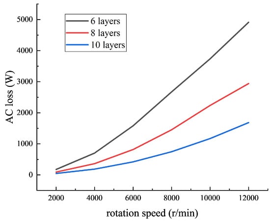 The AC losses generated at different numbers of conductor layers as the speed increases are shown in Figure 11. As the number of conductor layers increases, the cross-sectional area of a single flat wire decreases and the skin effect is weakened, which corresponds to a decrease in the AC copper losses generated.