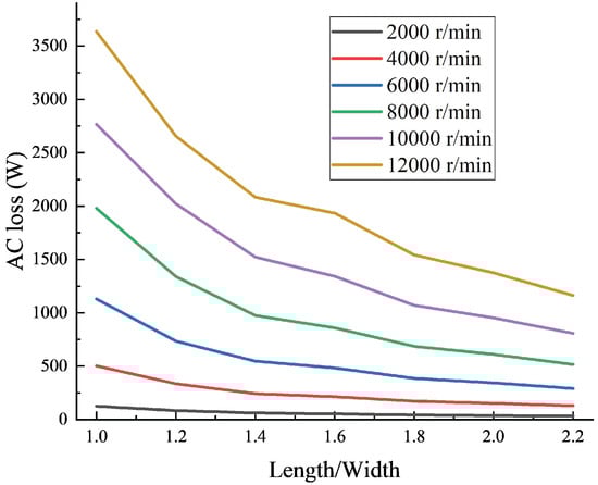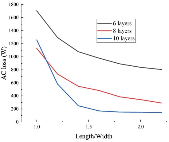 The flux density in the slot has a significant effect on the AC copper losses. To reduce AC losses, conductor width and height can also be optimized to avoid flux leakage near the stator slot openings. Optimization of conductor dimensions should also be considered when optimizing the motor. To reasonably assess the effect of the conductor aspect ratio on losses, a flat-wire motor with different conductor sizes ranging from 1.0 to 2.2 is modeled with the constraint of a constant conductor cross-sectional area under the premise of ensuring the stator outer diameter remaining unchanged, and the simulation results of AC losses with different numbers of layers are shown in Figure 14.