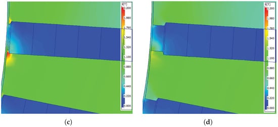 The tooth-tip magnetic density of different tooth-tip parameters. (a) B = 2.028. (b) B = 1.858. (c) B = 2.062. (d) B = 1.411.