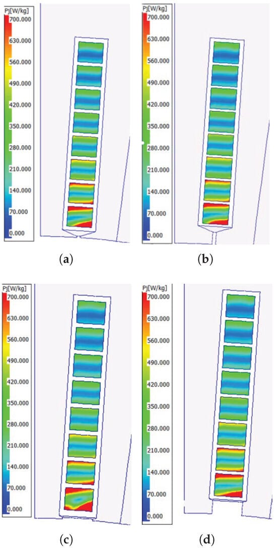 Conductor loss distribution in the groove with four groove shapes. (a) w = 0.5 mm; h = 0.2 mm. (b) w = 0.5 mm; h = 1.8 mm. (c) w = 4 mm; h = 0.2 mm. (d) w = 4 mm; h = 1.8 mm.