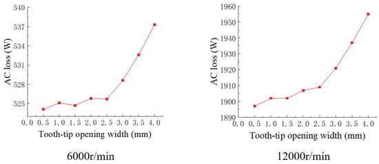 In the case of the same tooth-tip height h, the wider the tooth-tip, the greater the conductor loss caused by the permanent magnet, and the winding loss under different tooth-tip widths is shown in Figure 20. It can be seen that, regardless of the rated condition or high-speed condition, when the tooth-tip width is changed between 0.5 mm and 2.5 mm, the AC loss of the winding due to the permanent magnet does not change much and, when the tooth-tip width is 4 mm, the increase in the conductor loss is larger, which shows that changing the width of the tooth-tip opening in a certain range will not significantly reduce or increase the AC loss of the rectangular tooth-tip, but, when the width of the tooth-tip increases to a certain value, the AC loss of the winding caused by the permanent magnet will not be significantly reduced or increased. AC losses in the windings due to permanent magnets increase more substantially. The actual placement of the flat-wire winding should also be taken into account when selecting the slot width, where the tooth-tip opening width needs to be greater than the conductor width.