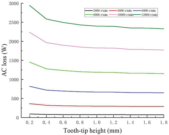 The tooth-tip opening height is one of the important factors affecting the AC losses of flat-wire motor windings. When the tooth-tip opening height increases, the conductor in the slot is far away from the permanent magnet, which makes the magnetic resistance at the tooth-tip opening smaller, which also makes it easier for the permanent magnet magnetic field to pass through the tooth-tip closure at the slot opening, thus protecting the conductor in the slot from the influence of the permanent magnet magnetic field. Therefore, precise control of the slot opening height is required to minimize motor losses. The slot opening height is modeled with different dimensions ranging from 0.2 to 2 mm, keeping other motor parameters unchanged, and the length of the stator yoke is shortened correspondingly with the increase in the slot opening height, and the results of the simulation calculation to obtain the AC copper consumption under the rated operating conditions are shown in Figure 21.