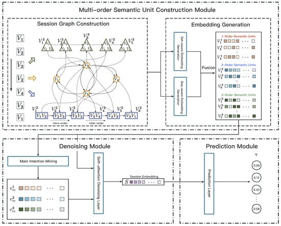 To tackle these two challenges, we designed an innovative model to accurately capture user intentions from two perspectives. Firstly, we proposed a new kind of multi-order semantic unit for analyzing user intentions. In previous methods, researchers used each individual item as a basic unit for this purpose. In our method, we combined consecutive items of different lengths as varying multi-order semantic units. Meanwhile, we improved the method for generating item embeddings, making it possible for information to propagate between semantic units of different lengths. Secondly, we developed a novel denoising module to explicitly differentiate and handle noisy items. Specifically, we proposed to mine the users’ main intentions in the session as the reference to calculate the importance of every semantic unit, and then assigned corresponding weights to each semantic unit based on their importance. Finally, we constructed a pure session embedding using the denoised session sequences.