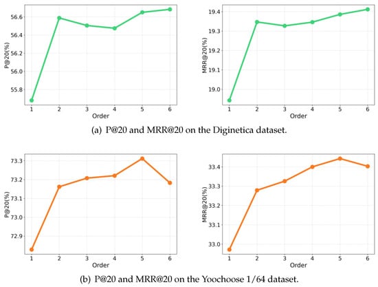 The primary distinction between the two datasets lies in the magnitude of improvement observed when utilizing the Yoochoose 1/64 dataset compared to the Diginetica dataset. This discrepancy can be attributed to the average session length; the Yoochoose 1/64 dataset exhibited longer average session lengths than the Diginetica dataset. Consequently, a dataset with lengthier sessions necessitates a higher order to effectively capture and model user preferences, leading to more substantial improvements in performance.